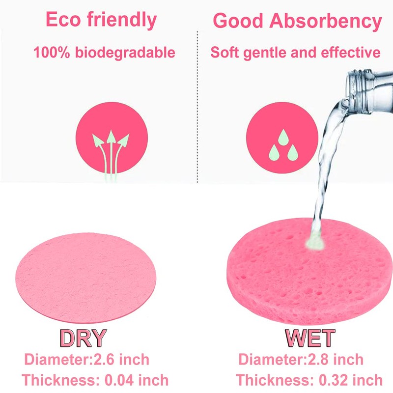 - 【Package & Size】: 50-count little round cellulose facial sponges. 2.8" dia. x 0.32" thick after hydrated