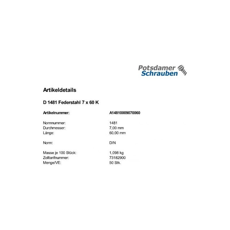 50 Dowel Pins Spring Steel DIN 1481 7X60