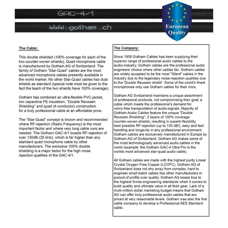 - Gotham AG - Switzerland (est. 1958) is the 1st cabling choice of most Audio Engineers & Manufacturers. Dubbed 'the most Silent' cables in the industry; exclusively manufactured in Europe using Linear Crystal Oxygen Free (LCOF) Copper.