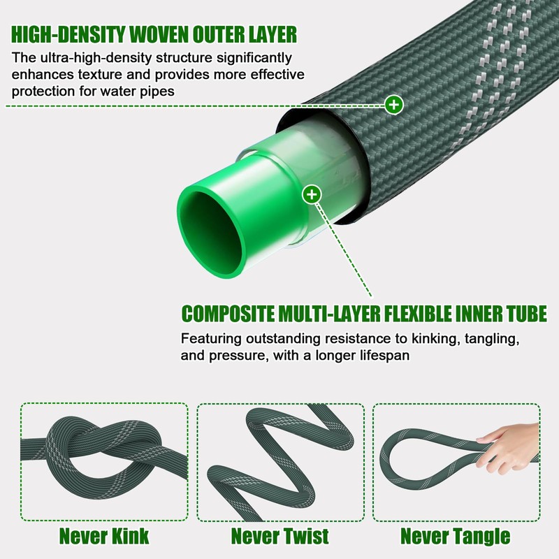 - UPGRADED GARDEN HOSE - The Hisens garden hose is constructed with an advanced woven outer fabric cover and a nano-composite inner tube. This design effectively solves the common issues of kinking and tangling that occur with traditional hoses, all while maintaining excellent flexibility and durability. The high - density woven outer layer offers extra protection, resisting wear, punctures, and breaks. This ensures worry - free performance for all your gardening and cleaning tasks.
