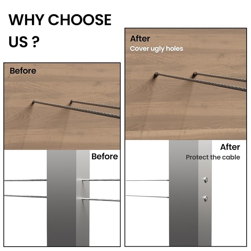 • Sleek Hidden Design: This discreet silver cable railing hardware features a fully concealed installation that tucks neatly inside 4"x4" posts made of metal, aluminum, or wood. The innovative design completely hides crimp marks for a seamless appearance, making it perfect for indoor and outdoor applications including decks, patios, boat railings, staircases, and porch installations.