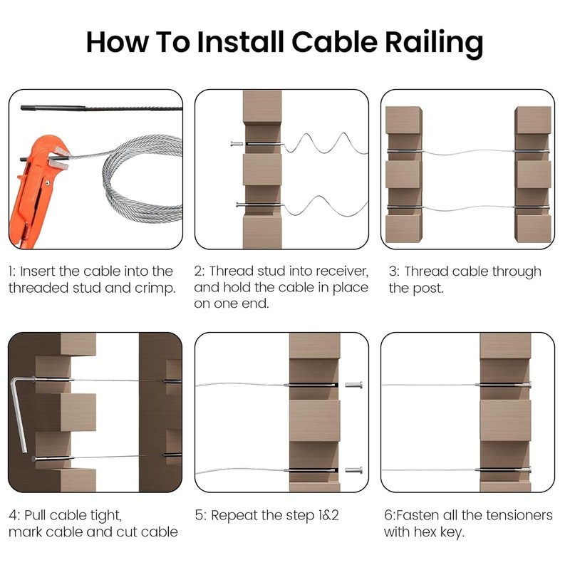 • Quick and Easy Setup: Connect Cable: Attach the wire rope to the stud using a hydraulic crimper Install Receiver: Insert the crimped stud into the post-mounted receiver Trim to Size: Cut the cable straight for optimal tension and alignment Secure Tightly: Use the included hex wrench to lock everything in place