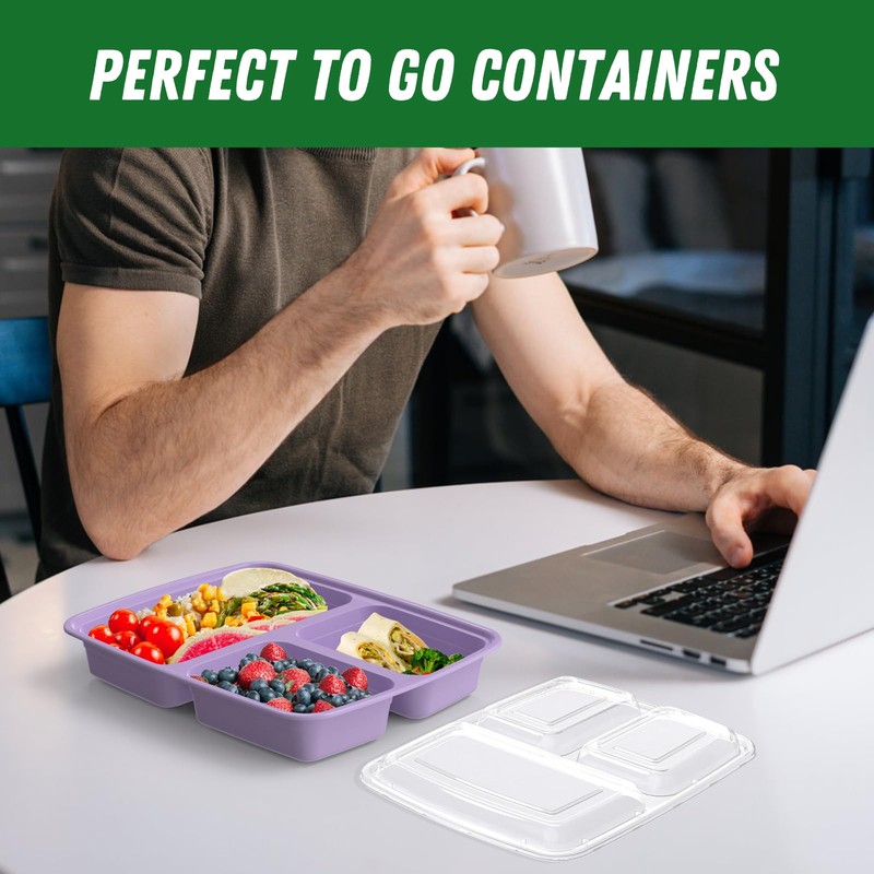 50 Pack (100-Piece) 32 oz Meal Prep Containers Reusable with Lids 3-Compartment, To Go Take Out Plastic Food Storage Containers, Sturdy Leakproof Food Safe, Microwave Freezer Dishwasher Safe, Lilac