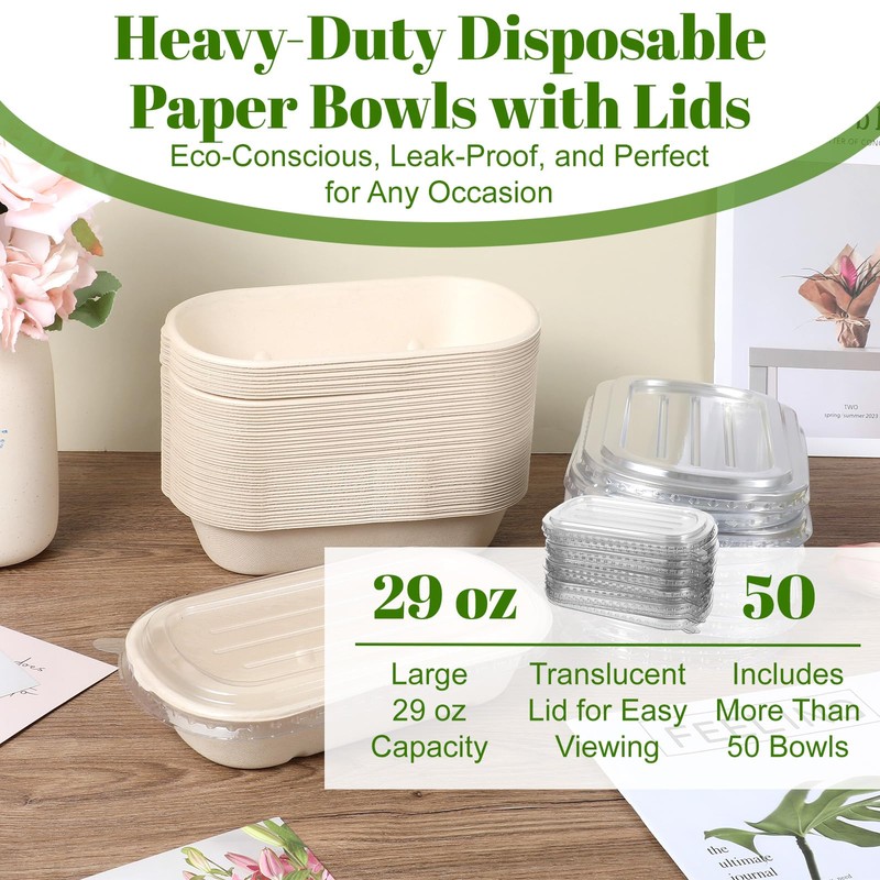 50 Pack 29 Oz Disposable Paper Meal Prep Containers with Lids Durable Compostable Paper Bowls Disposable Takeaway Food Containers Microwave Safe & Freezer Safe For Meal Preparation & Food Packaging