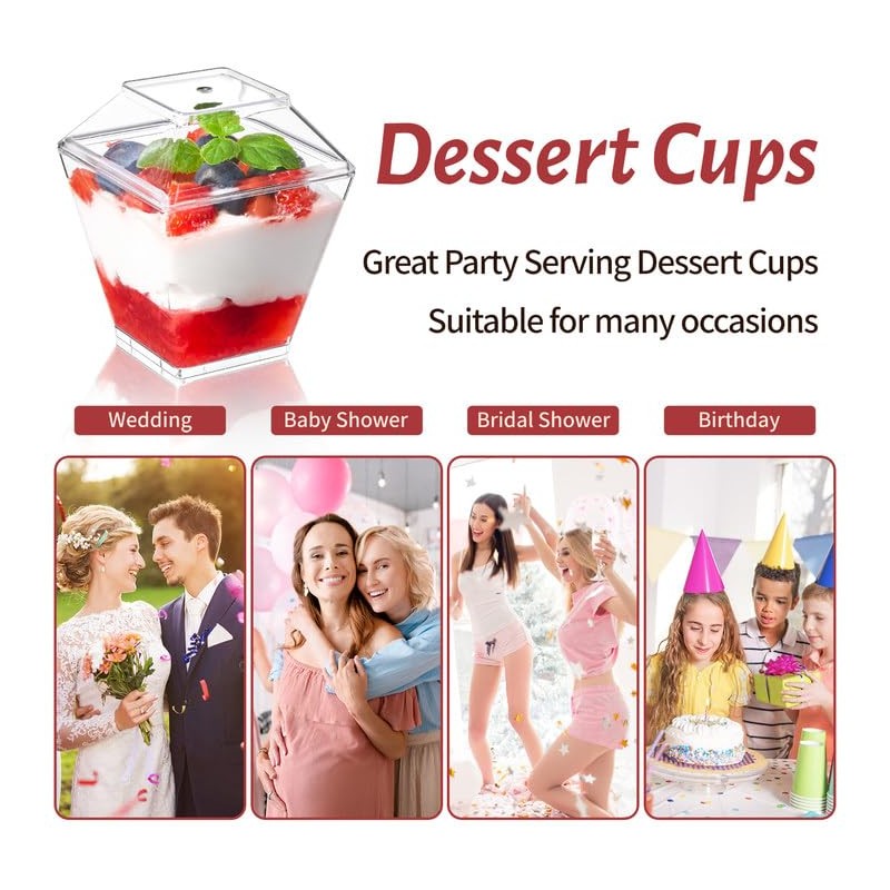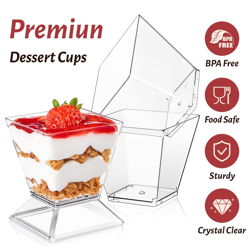 Each dessert cup is 3.5 oz, a great size for one-bite mini desserts, suitable for serving parfait, appetizer, salad, jello, pudding, fruits, mousse, etc.