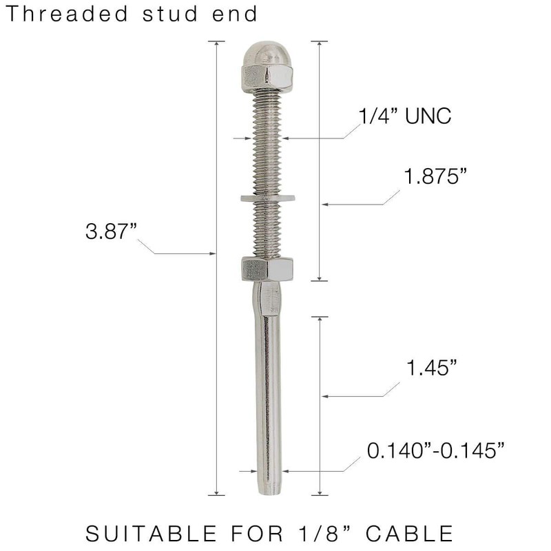 This cable stud end is for 1/8" cable. M6 x 1-7/8" thread length.High quality forged T316 marine grade stainless steel,