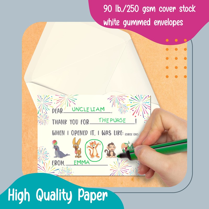 • CUTE DESIGN - Unique design with fun template for kids to write-in the card recipient's name, his/her own name, the gift received, and cute animal characters to circle for the child to depict his or her gratitude in a fun way