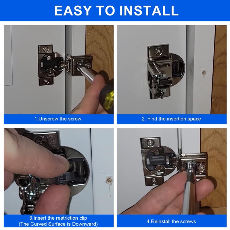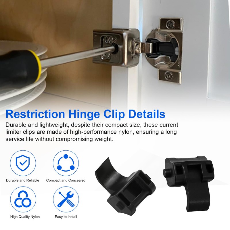 - 【Easy to Install】These cabinet door restrictor are made of durable nylon material, and the installation process is extremely simple. Simply remove the hinge from the cabinet door and easily snap the hinge limiter clip into the hinge mechanism. No tools are required, and the installation is completed quickly, saving time and effort.