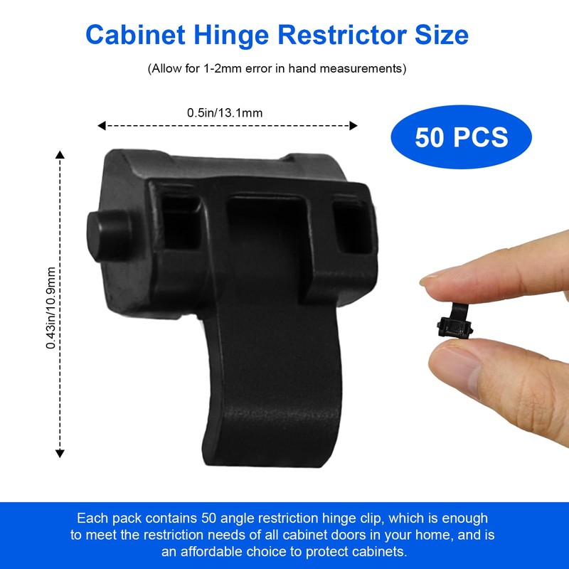 - 【Set of 50 Cabinet Restrictor Clips】Each pack contains 50 angle restriction hinge clip, with a size of 0.42'' × 0.47'', which is enough to meet the restriction needs of all cabinet doors in your home, and is an affordable choice to protect cabinets. With the hinge angle restriction clip installed you will find that the doors do not open as wide as before.