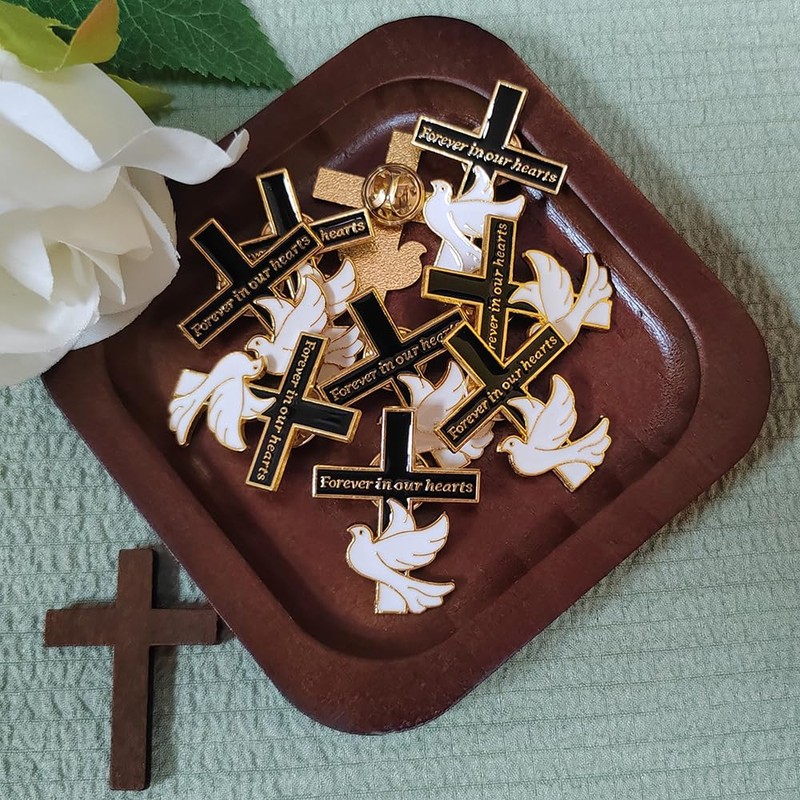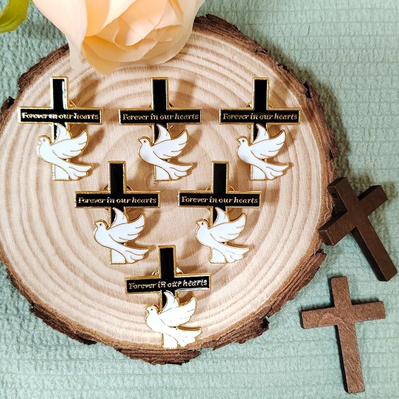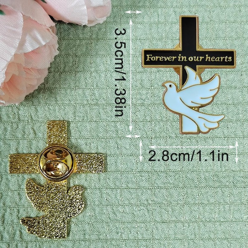 50 Pcs Funeral Cross Pins Forever in Our Hearts Memorial Dove Brooch for Memorial Service Mourning, Small, Metal, no gemstone