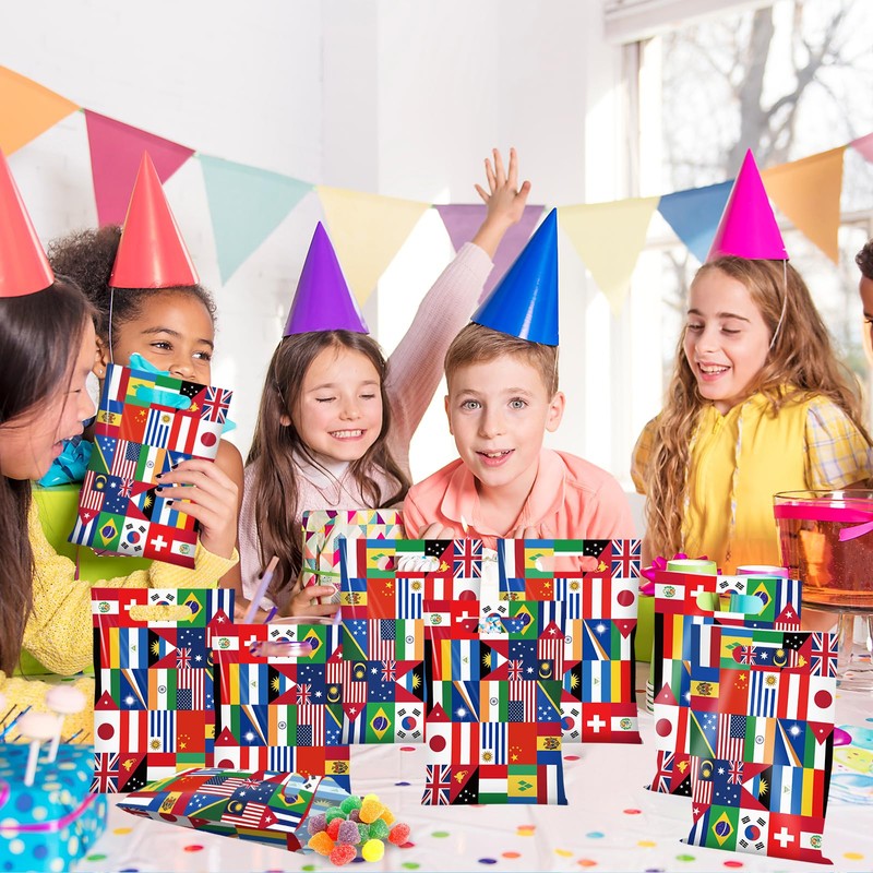 - Packing Include:our package have 50 pieces world flags party supplies bags,printed different countries flag,with enough quantity to decorate your party and place gifts;suitable for kids to pack small items,such as candies,snacks,small gifts and other party favors.
