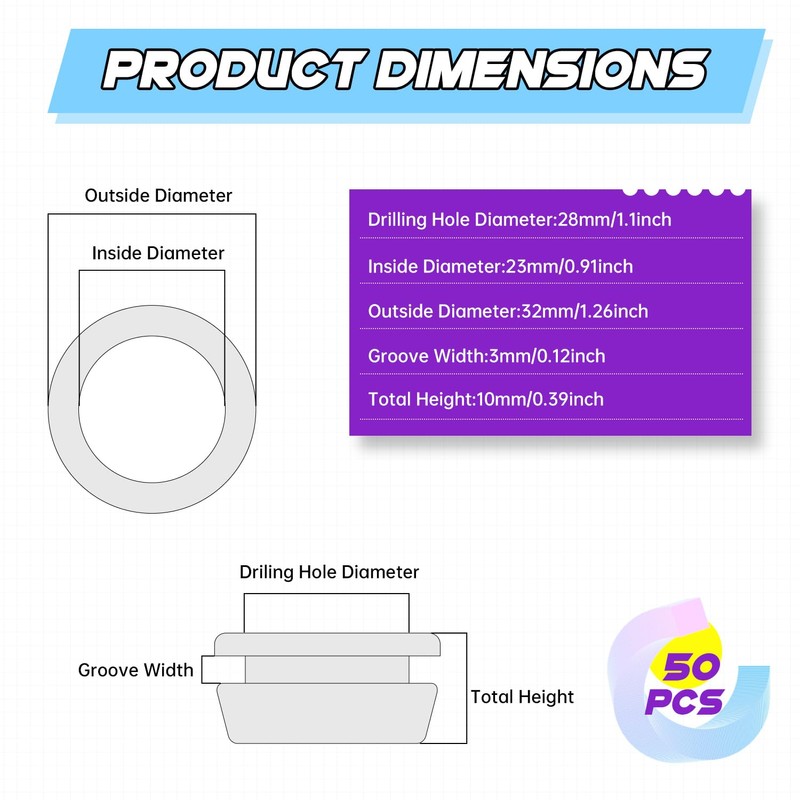 - Quantity and Size for Perfect Fit: Receive 50 pieces of rubber grommets, each with a 23mm/0.91" inner diameter (ID) and 28mm/1.10" outer diameter (OD). Overall diameter: 32mm/1.26", groove thickness: 2.8mm/0.11", and height: 10mm/0.39". Ideal for precise wire management and firewall hole sealing.