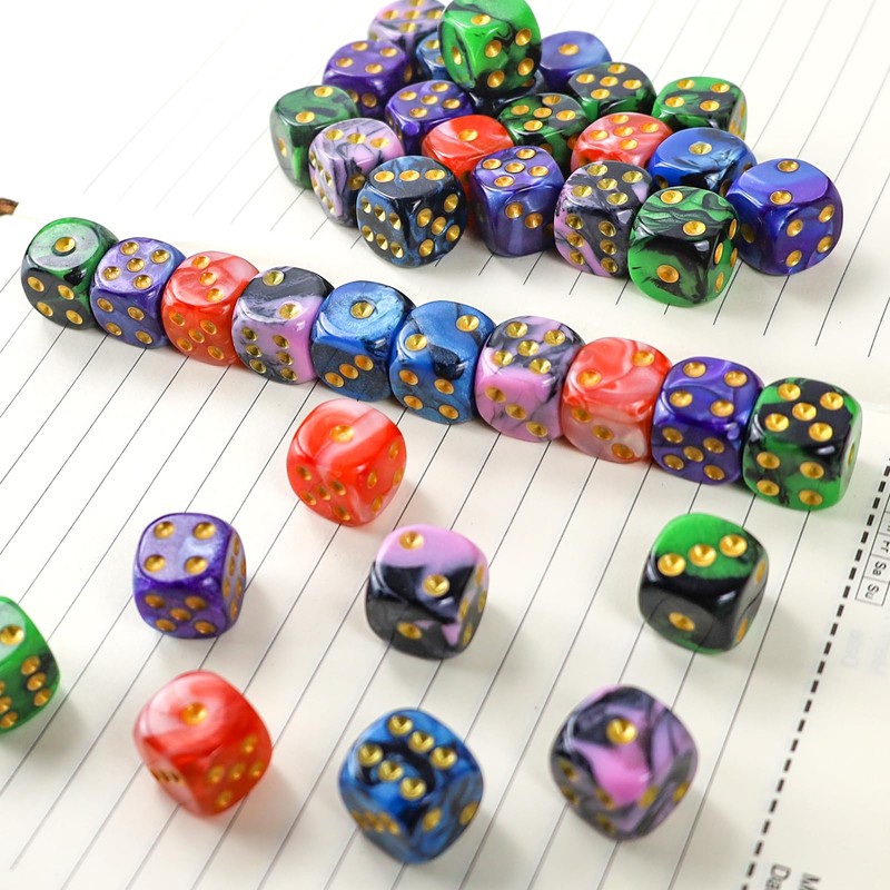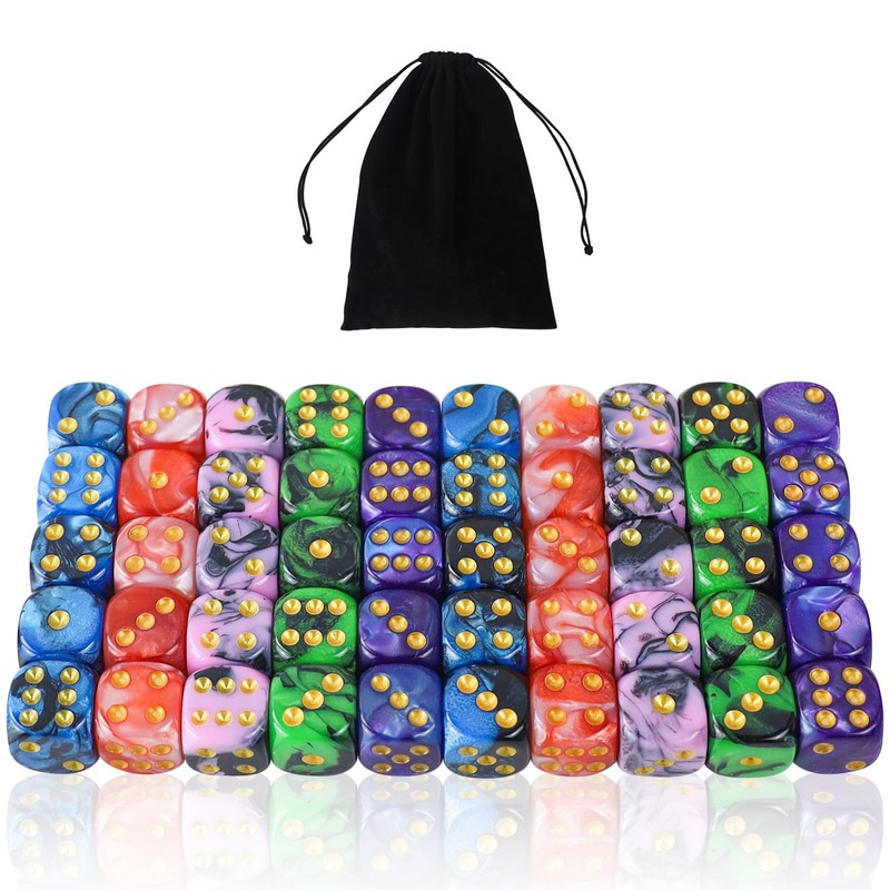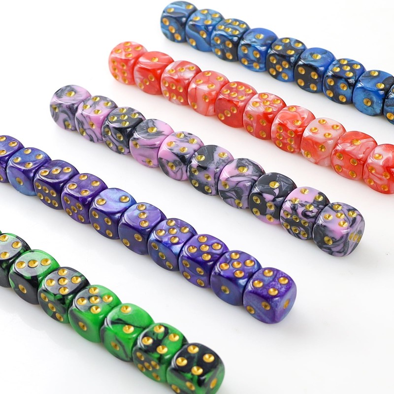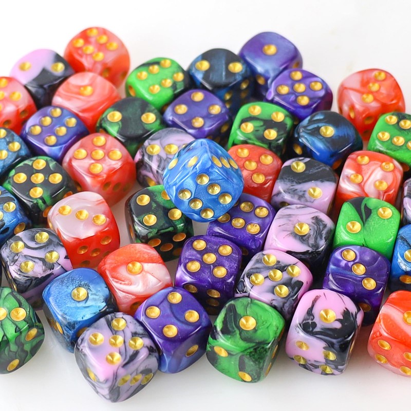 50 Piece Dice Set 6-Sided, 16 mm D6 Acrylic Gold Piping Dice, 5 Two-Tone Polyhedral Colour Dice for DND RPG Dice Games, Playing Games Such as Tenzi, Yahtzee, Mathematics Lessons