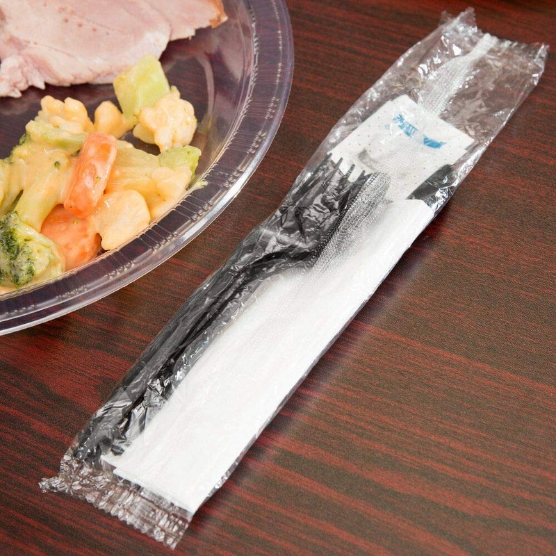 - FULL SET! - This set includes a knife, fork, spoon, napkin and salt and pepper packets so you can provide your guests with everything they need to enjoy their meal! Great for quick grab-and-go applications, this wrapped cutlery pack is a cleaner alternative to unwrapped plasticware. Plus, since it's all disposable, you won't have to worry about collecting and cleaning silverware at the end of meal service.