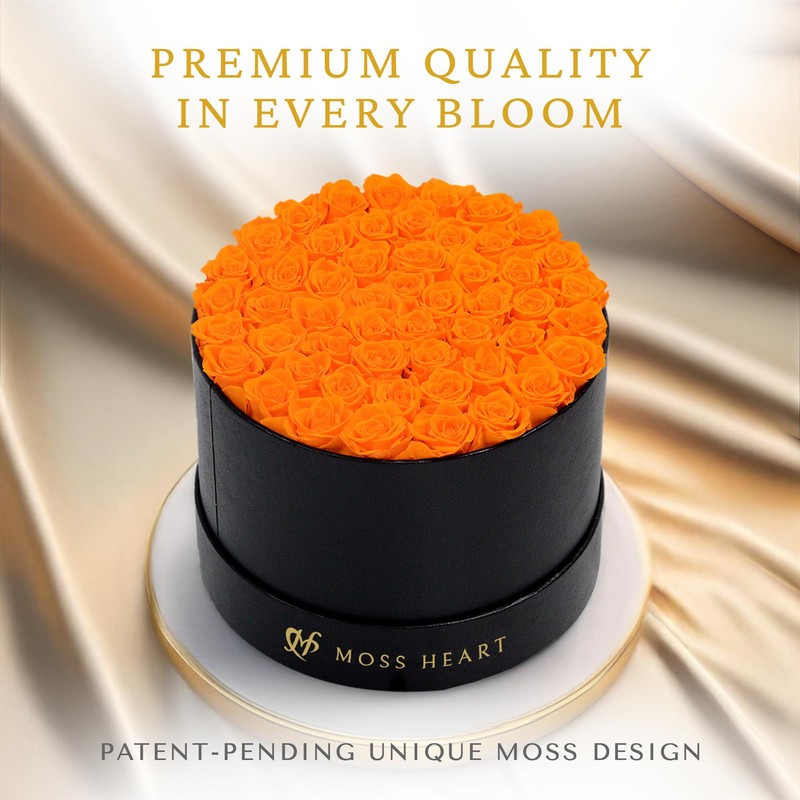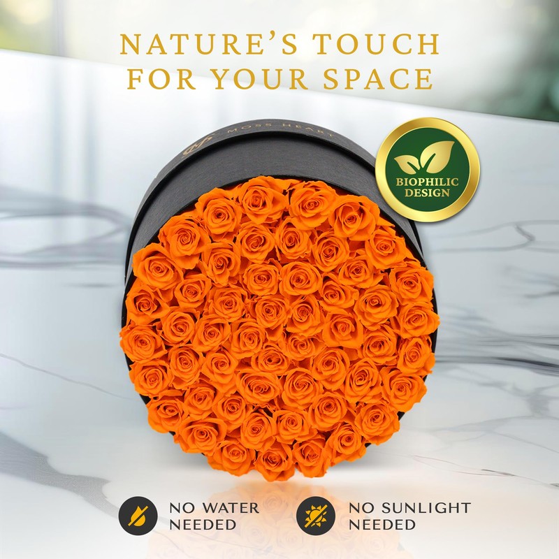 - 50 Forever Real Roses: Immerse yourself in a lavish sea of beauty with our premium preserved roses, artfully arranged to create a stunning bouquet. These vibrant orange forever roses are carefully preserved, offering lasting beauty.