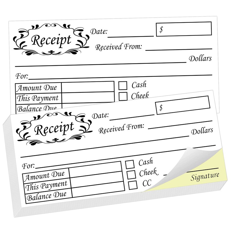 Quantity: 2 part carbonless receipt book, 50 Sets Per Pad.