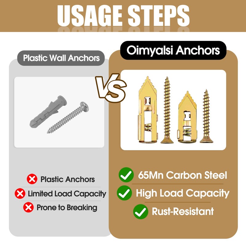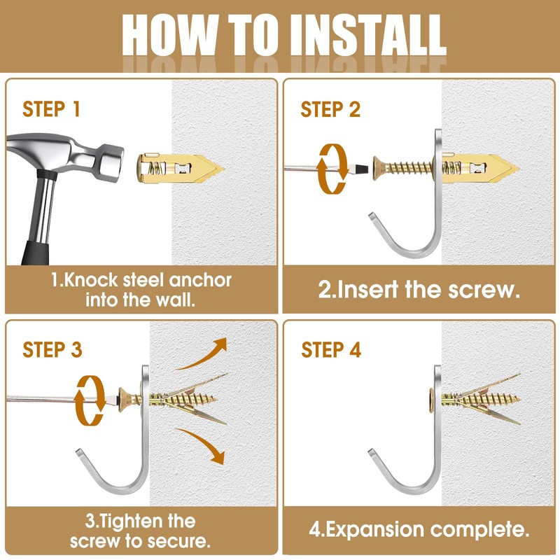 - 【Easy to Install】Insert the anchor, tap it into the wall, and tighten the screw—no need for pre-drilling. Strong expansion grip ensures a firm hold in drywall.