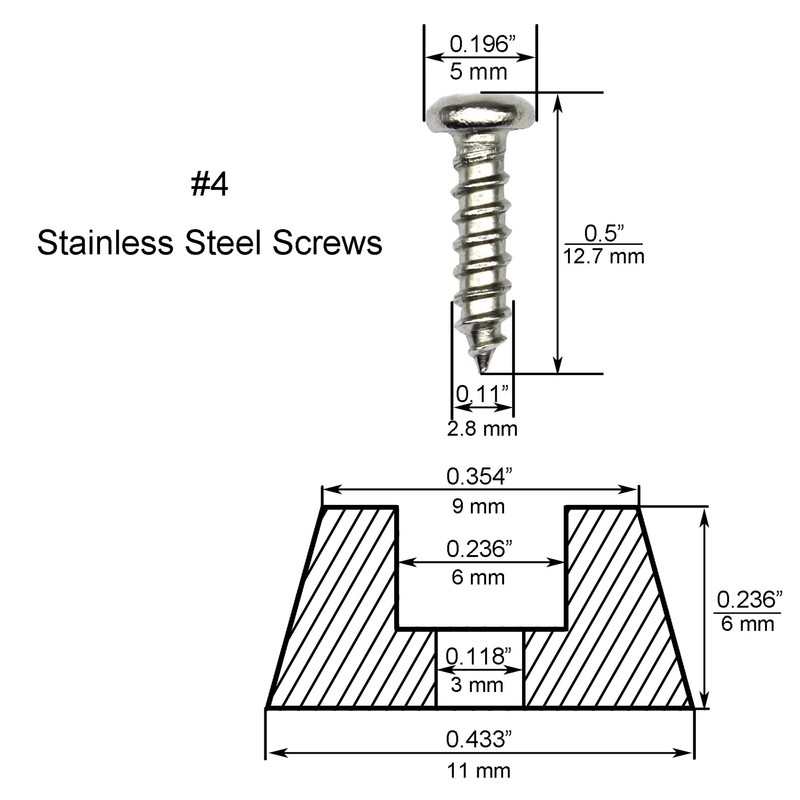 - The small rubber feet Size: 0.236" Tall x0.433" Top Width x 0.354" Bottom Width (6mm*11mm*9mm). Come with 1/2 inch #4 Stainless Steel screws;