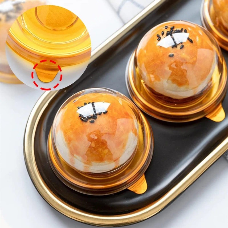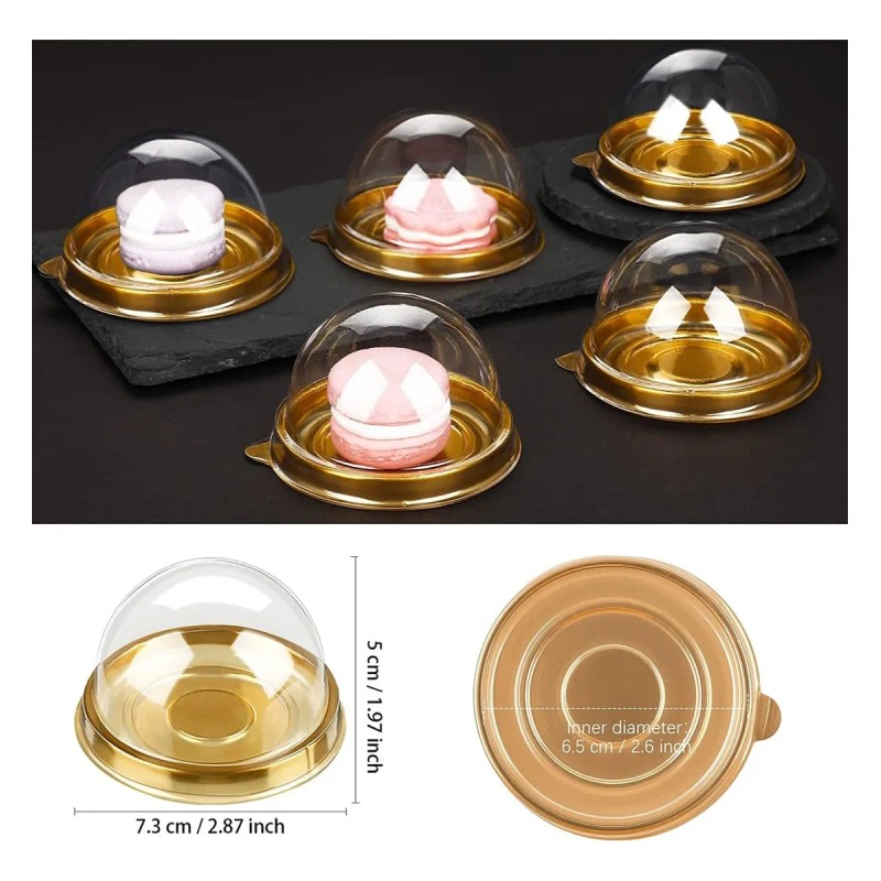 Detalles del Producto: Este soporte individual para cupcakes consta de una parte superior e inferior transparente con forma de cúpula que encaja perfectamente y no es fácil de separar. 50 fondos transparentes y 50 tapas doradas, aproximadamente Diámetro inferior: 7,1 cm, Diámetro interior: 5,8 cm, Altura: 5 cm.
