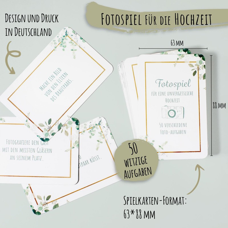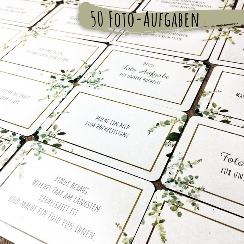 HOW IT WORKS The photo game contains 50 different photo cards on which there are different photo tasks that guests should do during the wedding. Simply place the cards on the tables and ask guests to take great photos over the evening. For this you can provide disposable, instant cameras or photo boxes. Guests can then send the photos to the email address or stick them into a photo album when using instant cameras. The great pictures are a beautiful reminder of this unforgettable day!