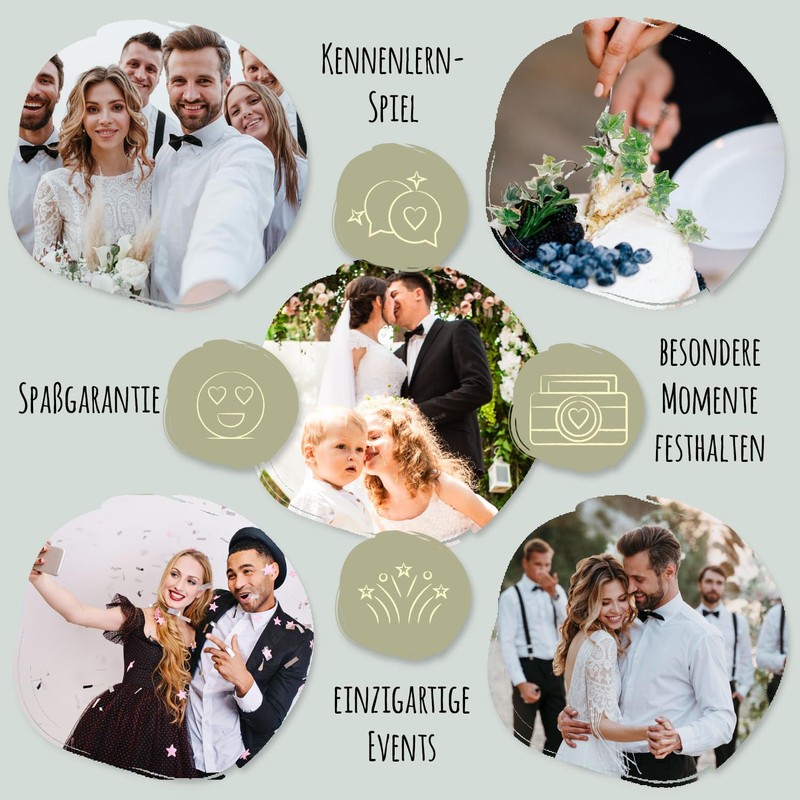 - Unforgettable moments: the photos can be glued together with the tasks in the wedding guest book. You can also provide disposable camaras or use a wedding photo box.