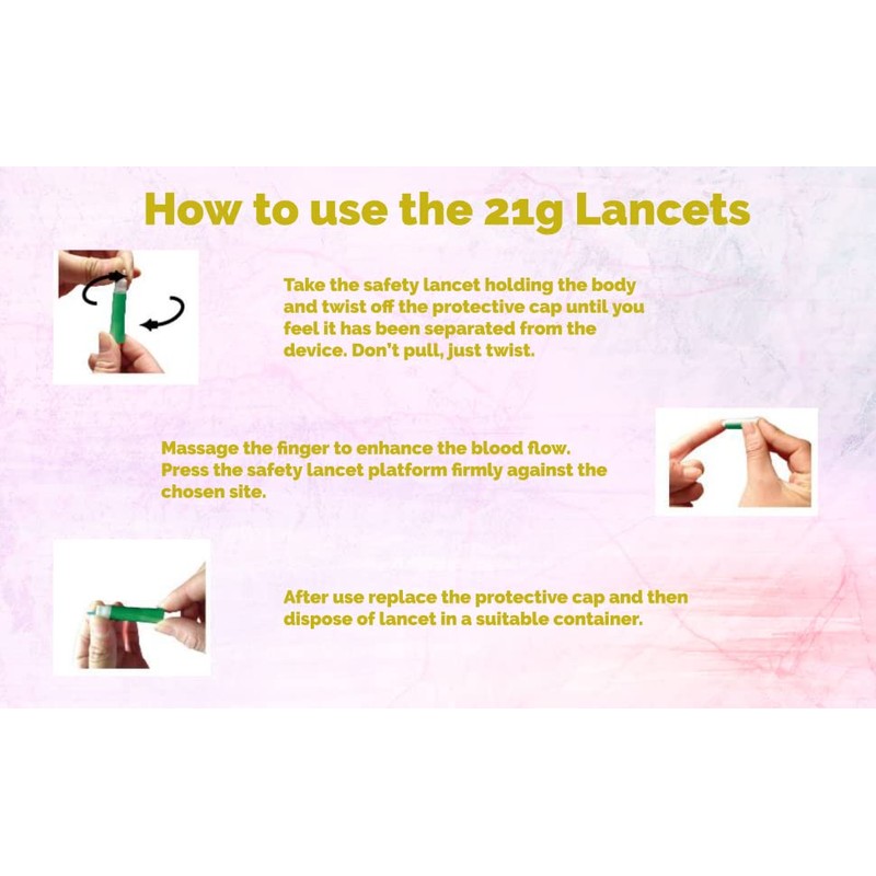 The lancets are a simple & easy to use tool to obtain a small blood sample and so can be used with a variety of testing kits such as blood glucose monitors and cholesterol monitors.