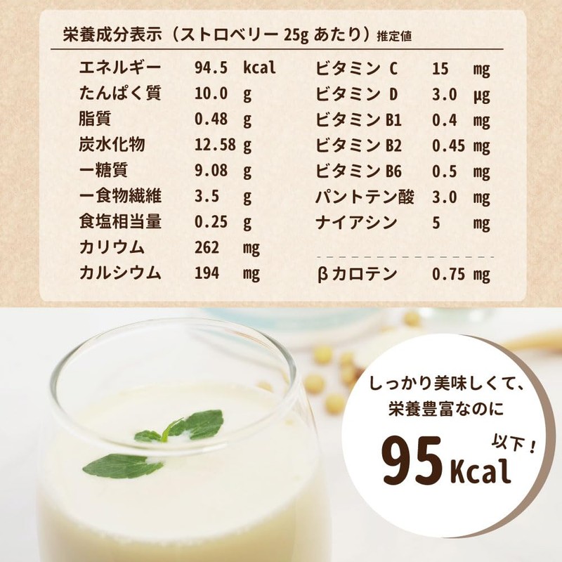 - 置き換えダイエットに最適なソイプロテイン。遺伝子組換えでない大豆使用。くどさがなく、すっきりとした甘みだから毎日飲みたくなる美味しさです。植物性たんぱく質のほか、美容と健康に欠かせないビタミンを8種類配合。