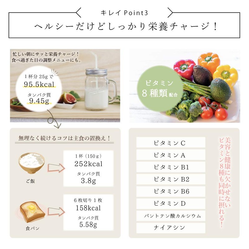 - 置き換えダイエットに最適なソイプロテイン。遺伝子組換えでない大豆使用。くどさがなく、すっきりとした甘みだから毎日飲みたくなる美味しさです。植物性たんぱく質のほか、美容と健康に欠かせないビタミンを8種類配合。