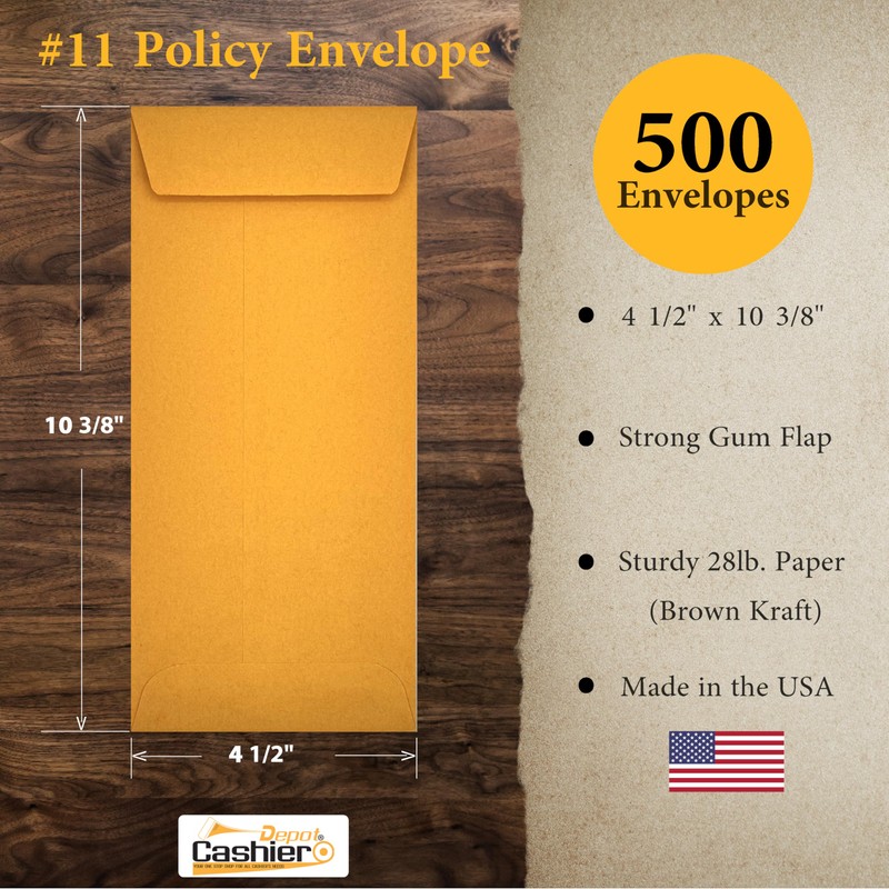 500 Cashier Depot #11 Policy (Open End) Envelope, 4 1/2 x 10 3/8, Sturdy 28lb. Gum Flap, 500/Box (Brown Kraft)