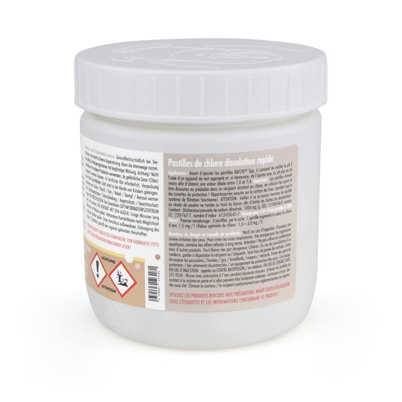- For the first filling, add three Bayzid mini chlorine tabs to 1,000 litres of fresh water. During operation, hot tub and spa chlorination: regularly measure the chlorine content in the pool and adjust it to the optimal value. One chlorine tablet per 1,000 litres increases the chlorine value of your pool by approx. 1.5 mg/l.