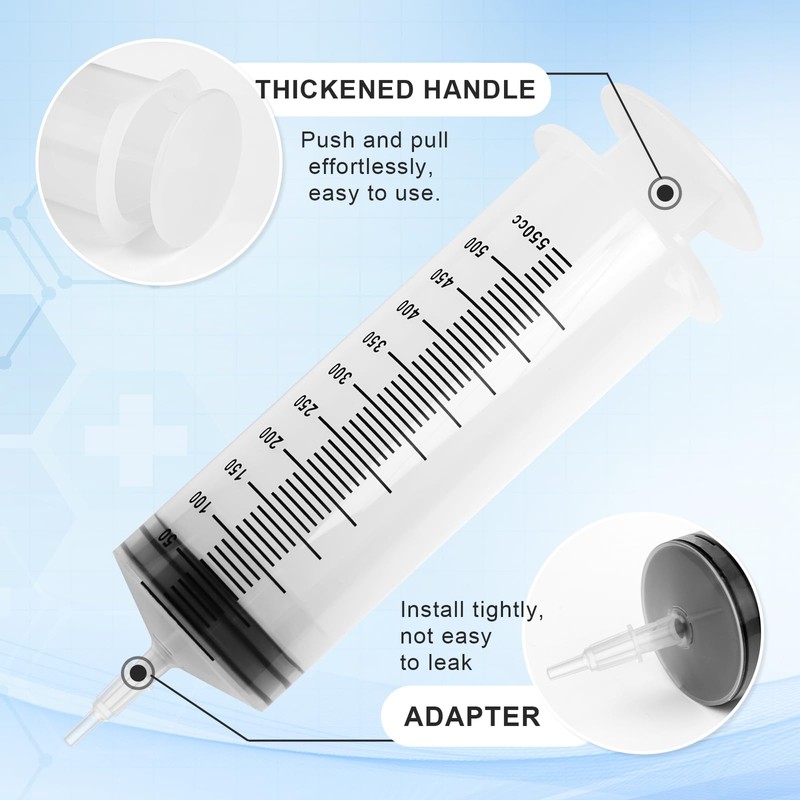 • MATERIAL & CAPACITY Made of high quality plastic, durable, waterproof and reusable. The syringe has a capacity of 500 ml.