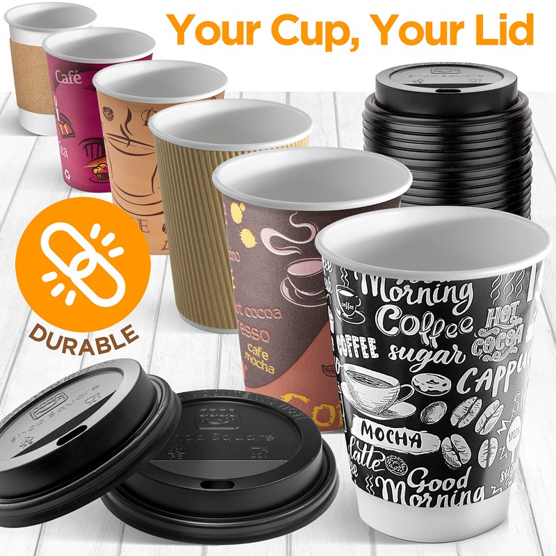 - One Size Fits All - These versatile coffee cup lids are compatible with different disposable cup sizes. These include 10, 12, 16, 20, and 24oz coffee paper cups and 8 oz. squat cups.