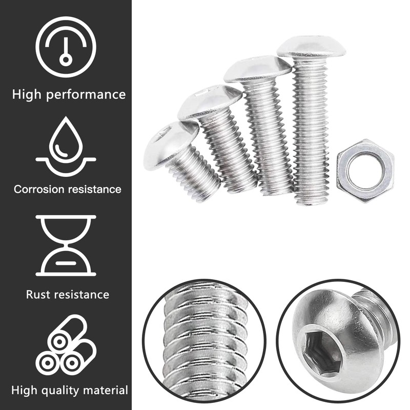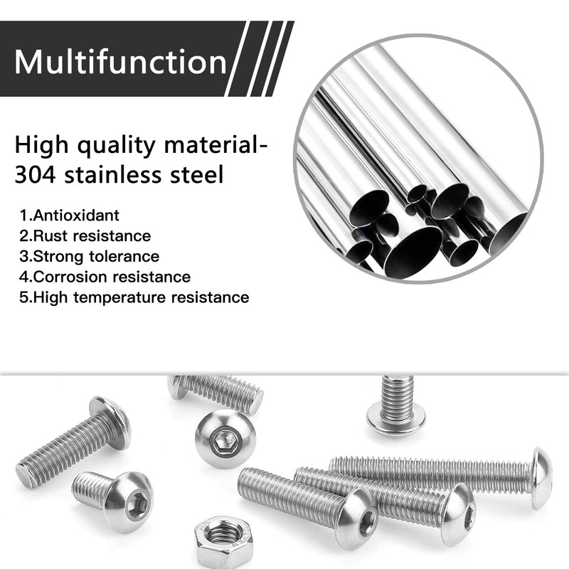 • 【HIGH QUALITY MATERIAL】Hex Button Head Socket Cap Screws Nuts Washers Assortment Kit Made of High Quality 304 Stainless Steel, m3 m4 m5 screws which Features is Strength and Offers Good Corrosion Resistance in Bad Environment and High Humidity Areas.