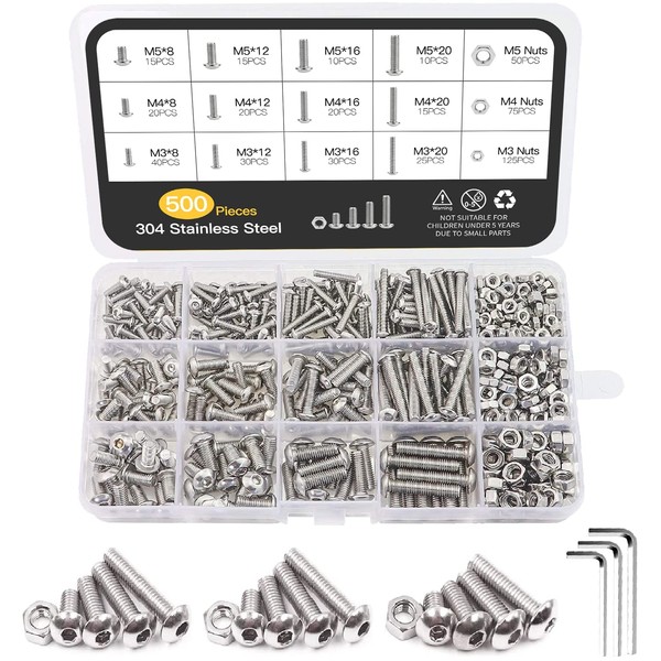 500 PCS Bolts Nuts kit M3 M4 M5 Screw Sets Stainless Steel Hex Button Head Socket Cap Screws Nuts Washers Assortment Kit Screw Sets with Allen Wrenches and Sturdy Plastic Organizer Box