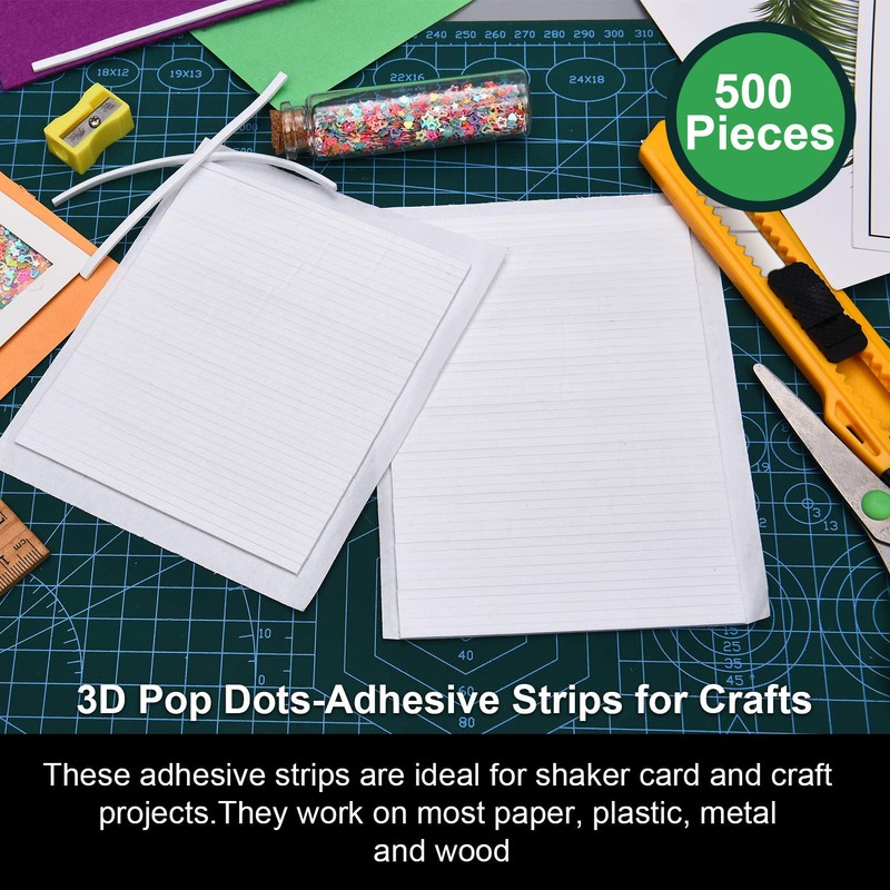 500 Pieces double sided foam sticky strips dual-adhesive 3d foam tapes foam strips adhesive mount for shaker card, scrapbooking or office supplies Make your craft wonderful: Application: Good for shaker card, scrapbooking, card making, greeting cards, invitations, add a three dimension to craft projects, acid free and will not harm items. Specifications: Material: EVA foam The size of each adhesive foam strip: as pictures shown Note: Please keep away from little kids. Manual measurement, please allow slight errors on size. The colors may exist slight difference due to different screens.
