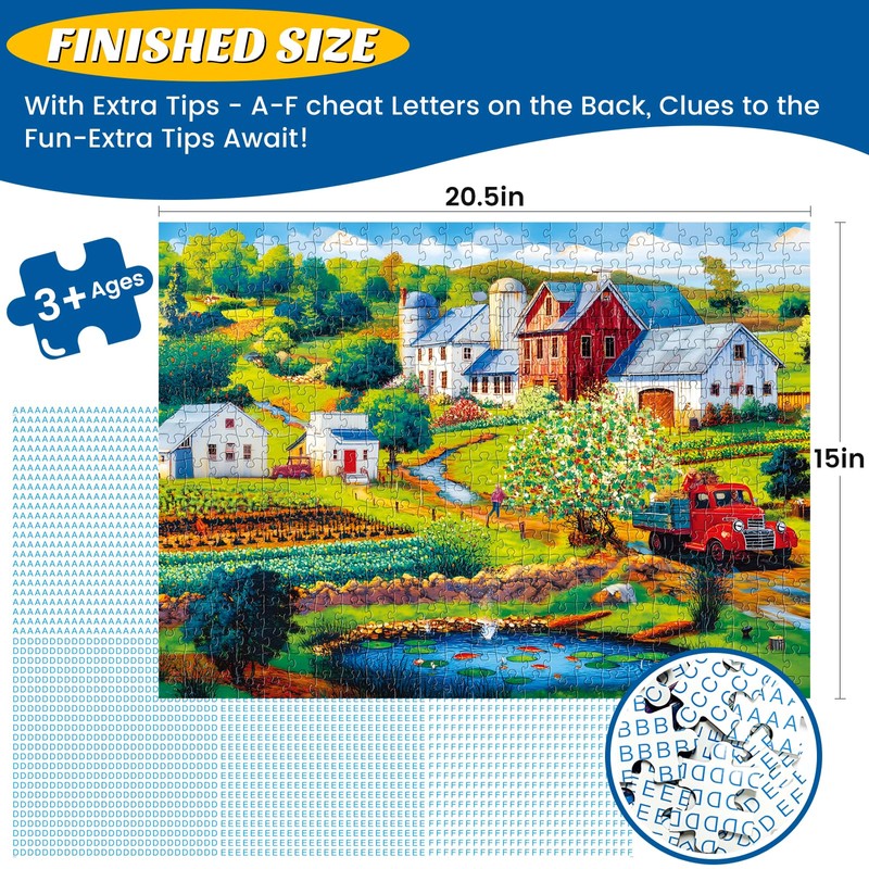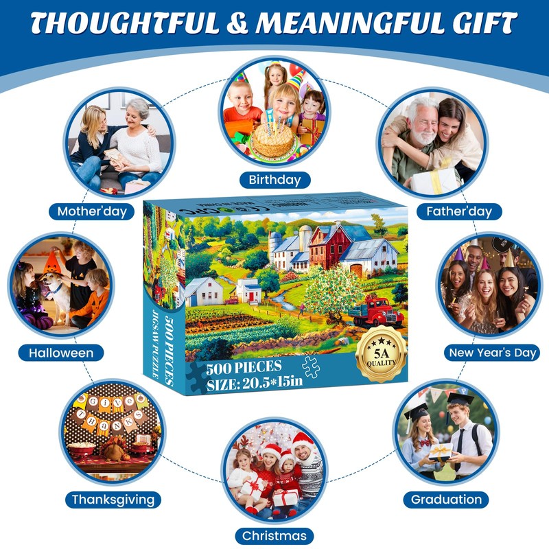 - 🧩 【300-Piece Country Farmstead】 🚜🌳 A peaceful farm scene with red barns, orchards in bloom, and a vintage truck parked by the fields. A classic countryside escape full of warmth and charm. 📦 Package includes: 500 pieces puzzle, free HD poster, storage mesh bag, and a gift puzzle box.