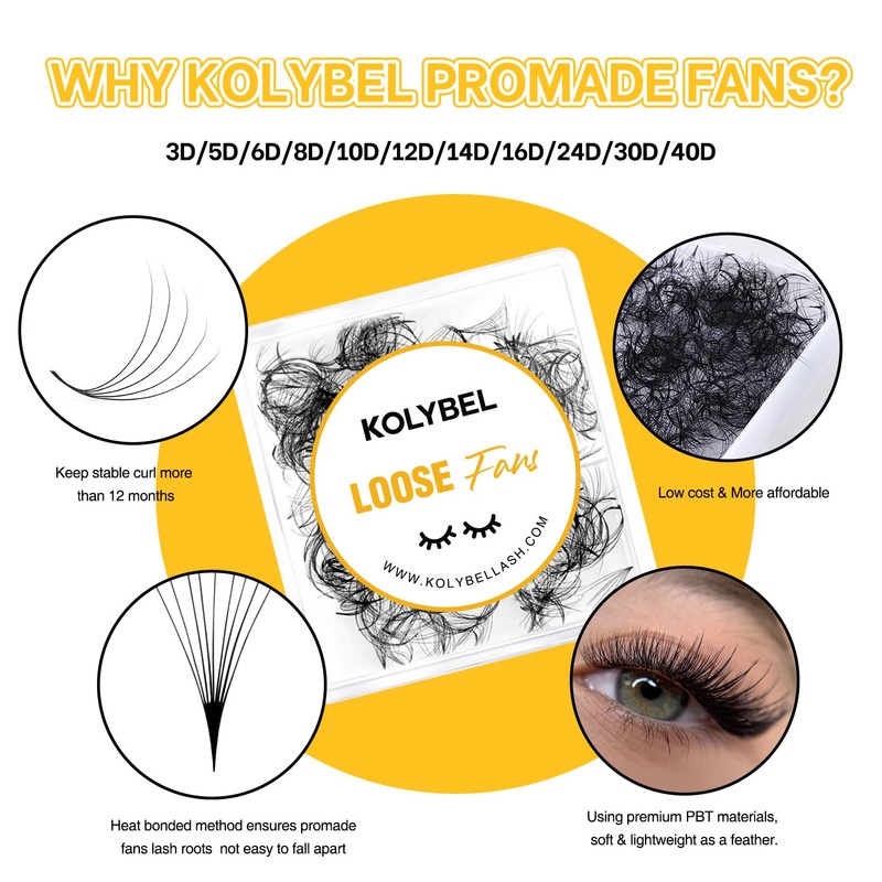 - COST EFFECTIVENESS:Kolybel Promade Fans Lash Extensions 500 fans/ box,8-15mm Single Length. Premade fans eyelash extensions mixed tray are more affordable and durable. Meet your needs in length, curl and thickness, and help you save money and time on choosing eyelashes.