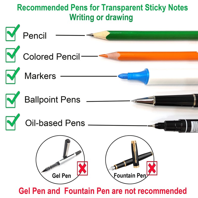 - Pens recommended for transparent sticky notes: Transparent sticky notes are made of high-quality PET material, smooth writing and waterproof, we recommend ballpoint pens, pencils, coloured pencils, permanent markers, oil-based pens for writing. Not suggest for ink pens, fountain pens, or water-based pens as they need more time to dry