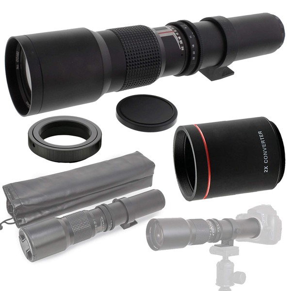 - 500mm (w/ 2x- 1000mm) f/8-32 HD Preset Telephoto Lens for Nikon D5, D4, D850, D810, D800, D750, D610, D600, D7500, D7200, D7100, D5600, D5500, D5300, D5200, D3500, D3400 DSLR Cameras