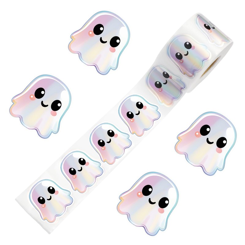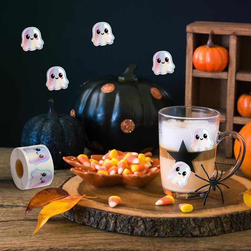 500Pcs Halloween Ghost Stickers Roll – Holographic Cute Ghost Stickers, Waterproof Self-Adhesive Halloween Sticker Decals for Party, Envelope, Scrapbook & Journal Decor (A)