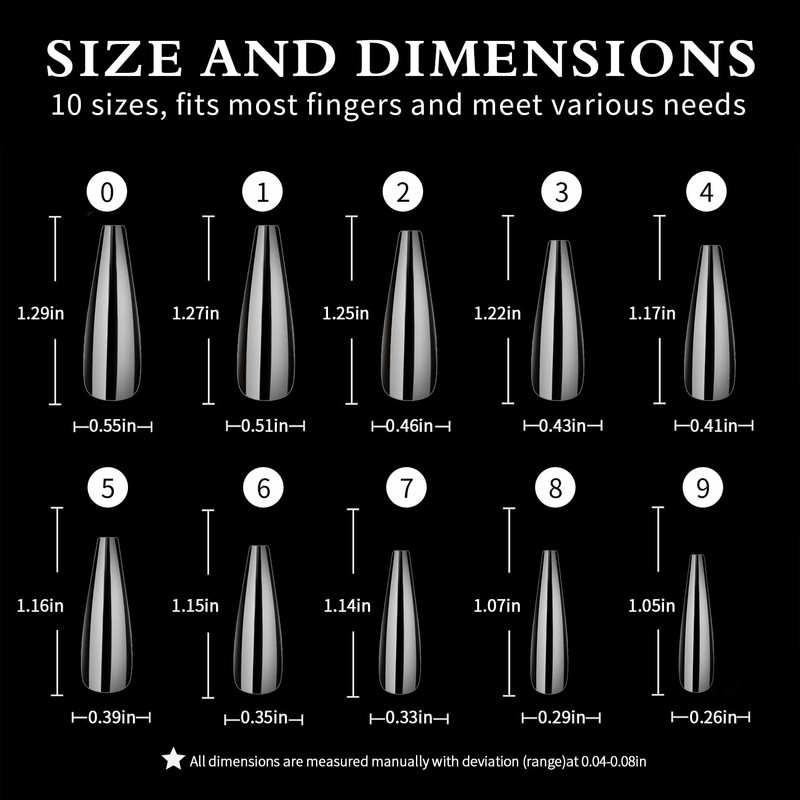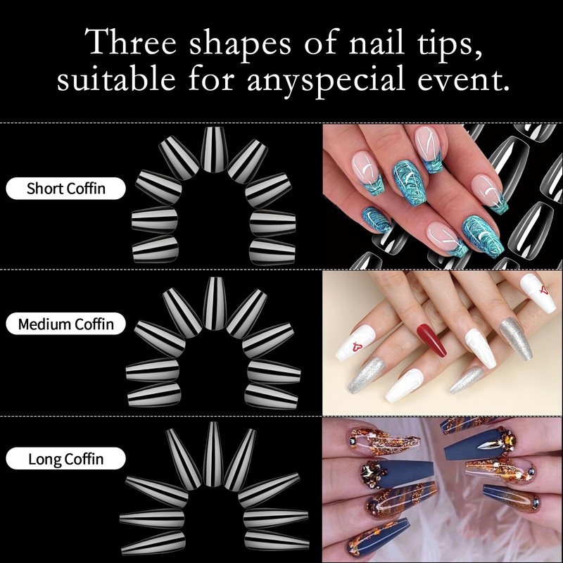 - 3 Shapes Nail Tips: short middle long coffin tips all have 12 sizes to fit all your nails. They are evenly distributed in the box, allowing you to easily and quickly select the nails you need.