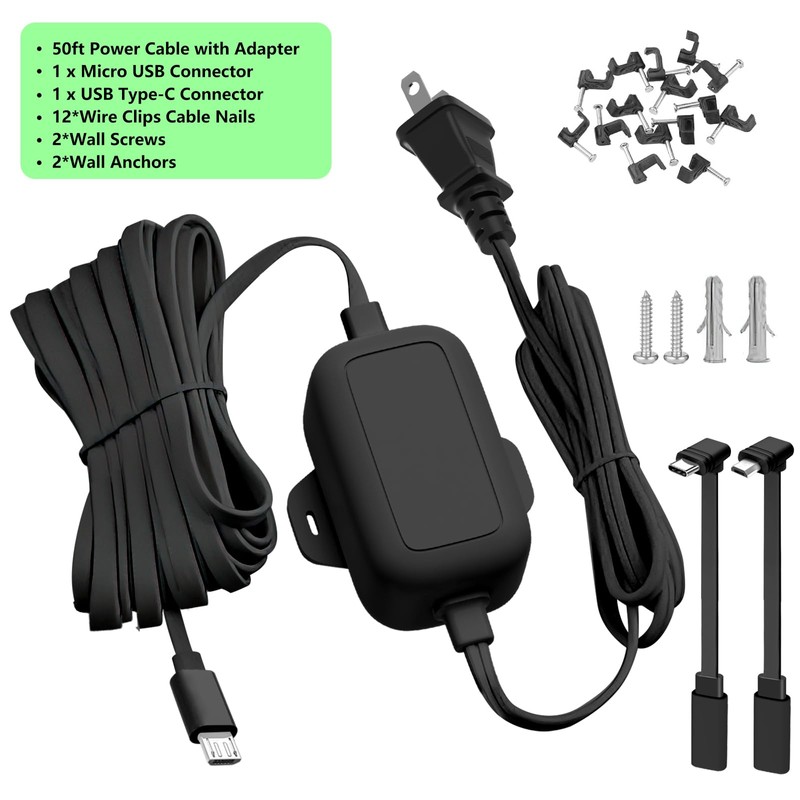 - 【50ft Long Flat Cable for Flexibility】 The 50ft cable allows you to position your camera anywhere while keeping a clean and discreet setup. Easily passes through tight spaces like doors and windows. Includes cable clips for secure mounting.
