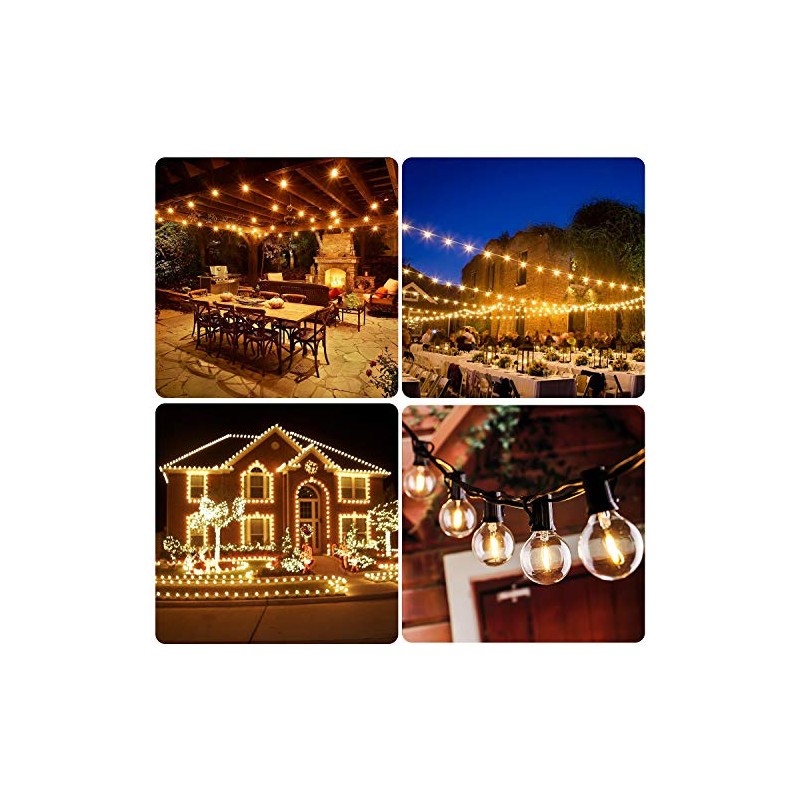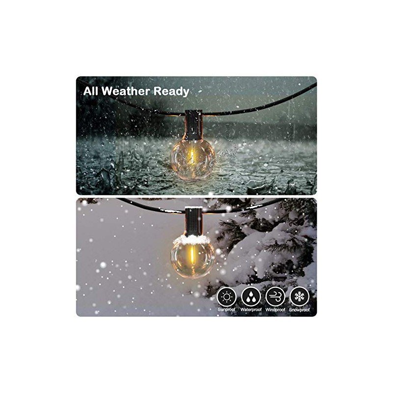 - 【G40 LED Bulbs & Energy-saving and Durable】Top quality outdoor string lights , the entire molded socket and integrated ring are made of strong rubber. It is equipped with G40 LED bulbs for outdoor string lights, which can provide you with a bright with warm atmosphere and save energy and electricity bills. The string lights is very safe to use, each string has been professionally tested. This is definitely a low-voltage, safe, reliable and all-season string light, very suitable for outdoor use.