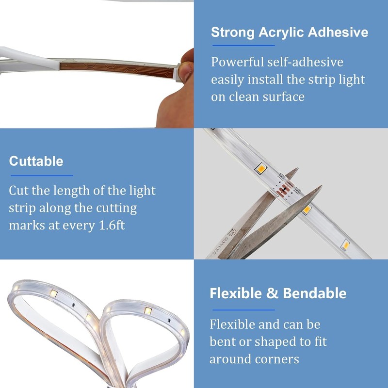 - Outdoor Waterproof Strip Lights: The LEDs of strip lights is fully covered in a silicone sheath that make the strip lights withstand any weather conditions. IP65 waterproof design and all-round glue coating make them durable and suitable for outdoor and indoor decor
