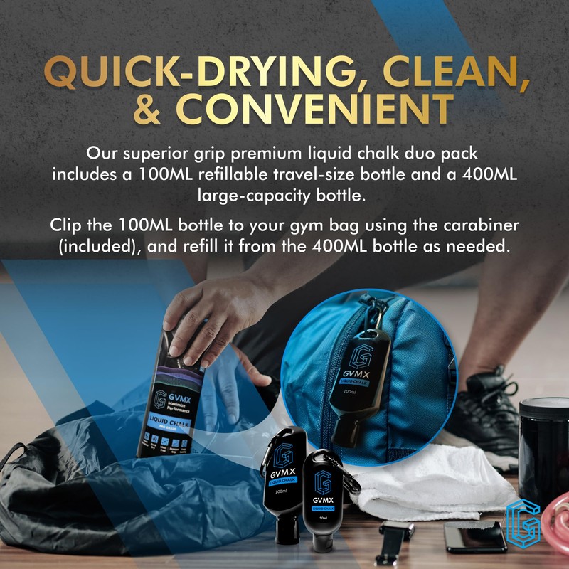 - 𝗔𝗱𝗱𝗶𝘁𝗶𝘃𝗲-𝗙𝗿𝗲𝗲 𝘄𝗶𝘁𝗵 𝗡𝗼 𝗥𝗲𝘀𝗶𝗱𝘂𝗲: GVMX hand chalk is no ordinary chalk powder. Nor is our workout chalk anything like other brands of liquid chalk gym enthusiasts use. Besides being additive-free, it leaves no chalk marks on your phone or sport equipment.