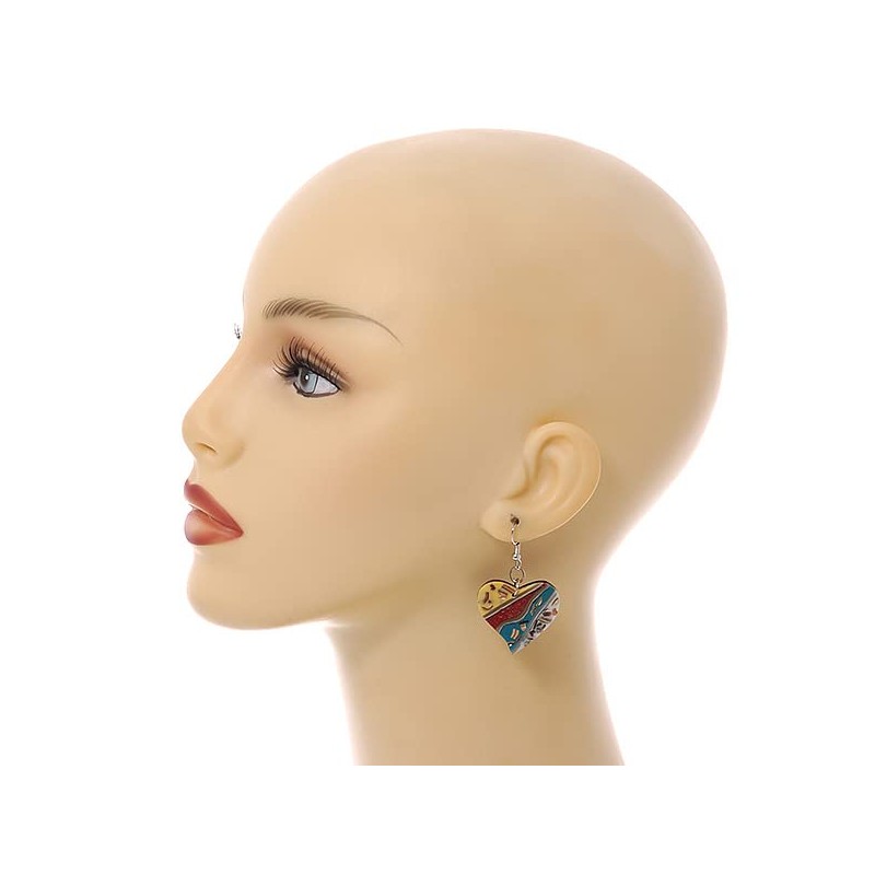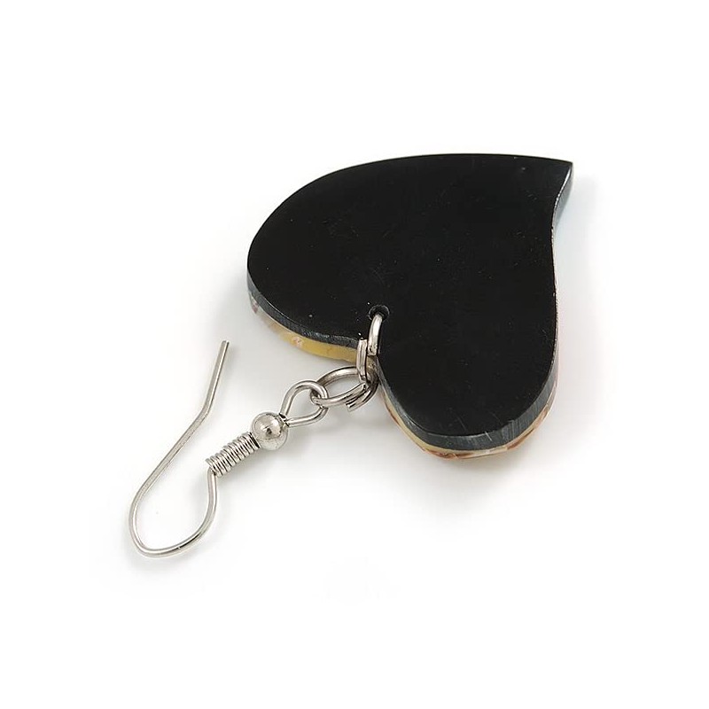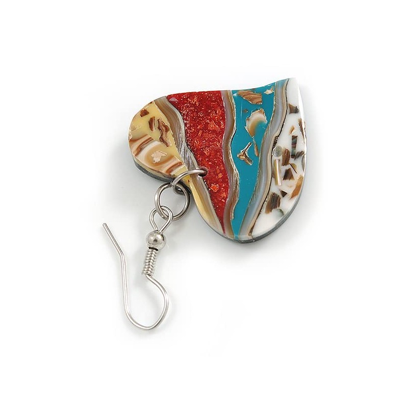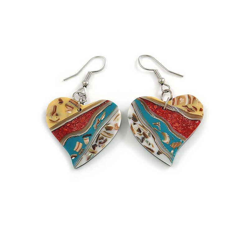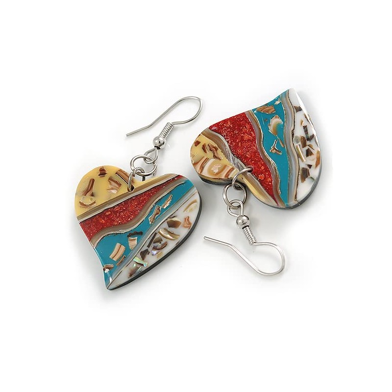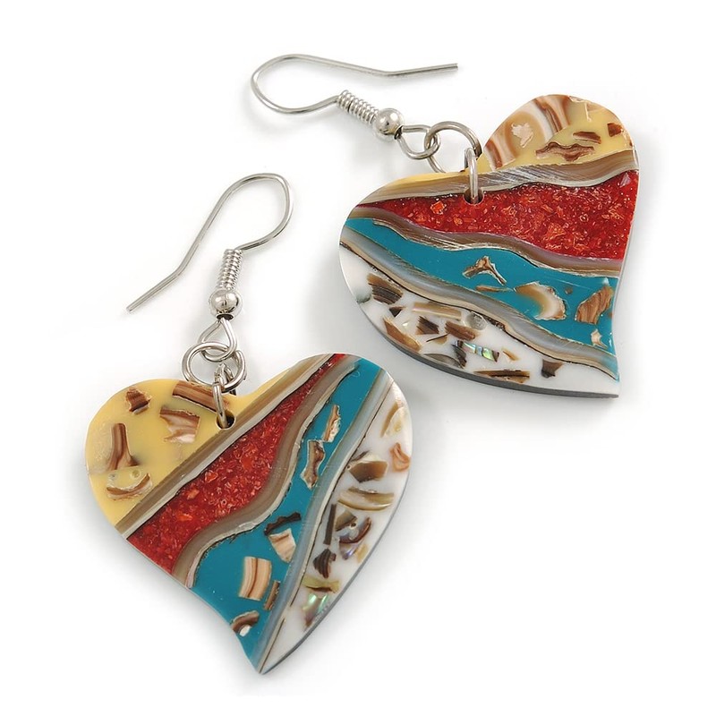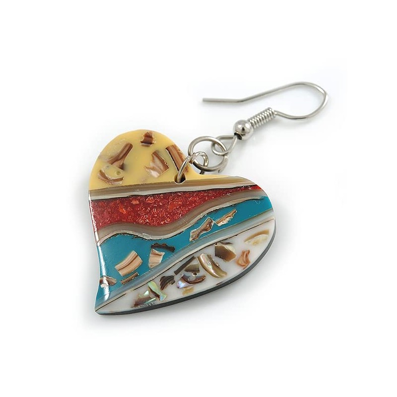Make a splash with these 50mm L/Multicoloured Heart Shape Sea Shell Earrings/Handmade. Featuring a heart shape design, made of sea shell in hues of red, yellow, teal and white. They have a total drop of about: 50mm Long, 30mm Wide. Secure with a silver tone shepherd's hook fastening. Each earring weight is about 4g. Also, check our store for a matching brooch B05118 and a necklace N06705.