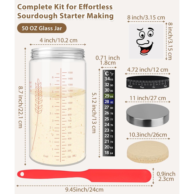 • Complete Sourdough Starter Jar Kits: It comes with a 50 oz glass jar, aluminum lid, cloth cover, date-marked feeding band, thermometer, and silicone spatula. There are clear scales on the jar which can easily show you the weight of starters