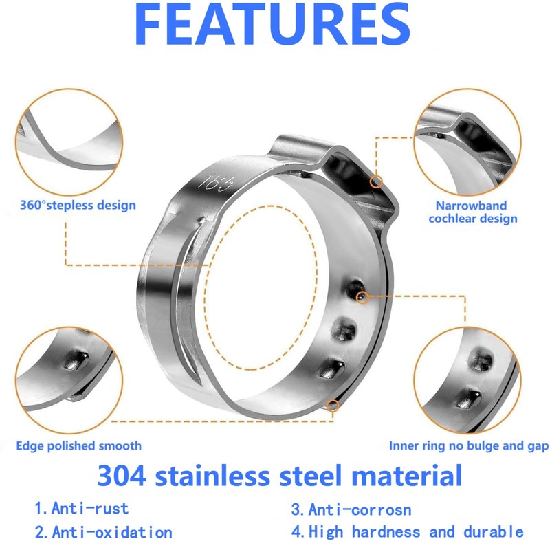 - 【360°Stepless Seal】 The edge of all stepless ear clamps are polished smooth, not damage the hose. 360°Stepless Design, no inner protrusion/gap. Narrow band design provide a more centralized seal pressure.