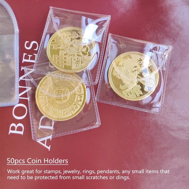 - 50pcs Coin holders. Perfect to keep coins safe. Flap stays closed via static and the plastic is flexible. Size: 2.0" x 2.1".