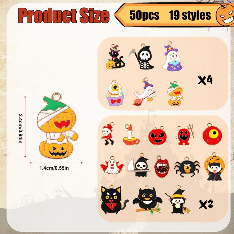50pcs Halloween Charms, Halloween Hanging Ornaments Enamel Pumpkin Ghost Bat Horror Charm Pendants for Bracelet Necklace Earring Jewelry Making DIY Craft Gifts (Style A, 19 Styles)